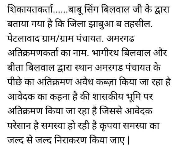 ग्रामीण बाबू बिलवाल के द्वारा पंचायत क्षेत्र में फैले अतिक्रमण को लेकर लंबे समय से प्रशासन को शिकायत की जा रही है, वहीं बाबू बिलवाल के द्वारा सीएम हेल्पलाइन पर भी ग्राम पंचायत अमरगढ़ की शिकायत की गई है। बाबू बिलवाल ने बताया कि ग्राम पंचायत अंतर्गत शासकीय भूमि पर लोगों ने कब्जे कर लिए हैं लेकिन पंचायत की ओर से कोई ध्यान नहीं दिया जा रहा है। सरपंच की मिली भगत से दिन पर दिन पंचायत की शासकीय भूमि पर लोग अतिक्रमण कर रहे हैं। सीएम हेल्पलाइन पर शिकायत के बाद ही पंचायत में कोई कार्रवाई होती है किंतु पंचायत स्तर से कोई सुनवाई नहीं की जाती है। चुनाव के समय जो वादे किए थे वो पूरे नही हुए, लोग आज भी पानी की समस्या से पीड़ित है। गंदगी पसरी पड़ी है।