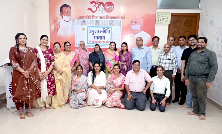 रतलाम अणुव्रत समिति के नव निर्वाचित पदाधिकारीयो का पद ग्रहण व शपथ समारोहसेठ जी का बाजार स्थित तेरापंथ सभा भवन पर संपन्न हुआ । नव मनोनीत अध्यक्ष अंगुरबाला माँडोत को निवृत्तमान अध्यक्ष ज्योति पीपाड़ा ने पद की शपथ दिलाई। इस दौरान मंत्री रत्ना भटेवरा, कोषाध्यक्ष ममता गांधी उपाध्यक्ष विशाल भागूँ , गौतम बोहरा सह मंत्री अनिल कालिया, समीक्षा दख प्रचार मंत्री दीपा राजावत ,अनिल बम कार्यकारिणी सदस्य निपुण कोठारी, जीवन मूणत, विपिन बोहरा, हेमंत दख, हैप्पी वोहरा, अभिषेक व्यास, संगीता मूणत, पियूष दख, पुनीत भंडारी, ज्योति दख ने पद की शपथ ली शपथ अध्यक्ष अंगुरबाला मांडोत ने दिलवाई। कार्यक्रम को संबोधित करते हुए रवि जैन एडवोकेट ने कहा कि अनुव्रत एक विचार है जिसमें सभी धर्म के लोग शामिल हैं। अणुव्रत का संदेश है व्यसनमुक्ती हो सारा देश। उन्होंने कहा कि मानवता की न्यूनतम आचार संहिता है अणुव्रत, मनुष्य को सही अर्थ में मनुष्य बनाने का उपक्रम है अणुव्रत । कार्यक्रम का संचालन अंगूर बाला माँडोत ने व आभार रत्ना भटेवरा ने माना ।